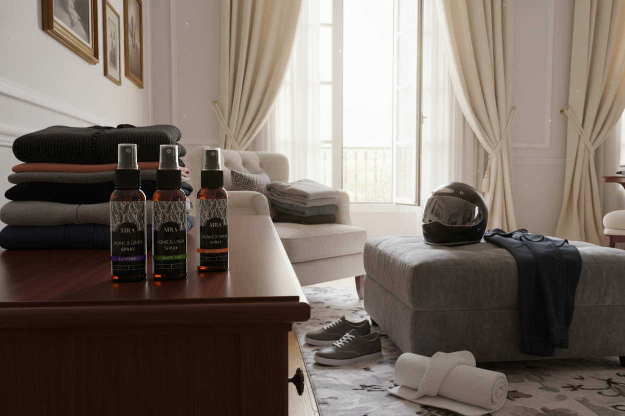 Semprotkan AIRA secukupnya pada kain yang bersih dan kering dari jarak ±20–30 cm. Biarkan beberapa saat hingga aroma menyatu dan kain siap digunakan kembali.
